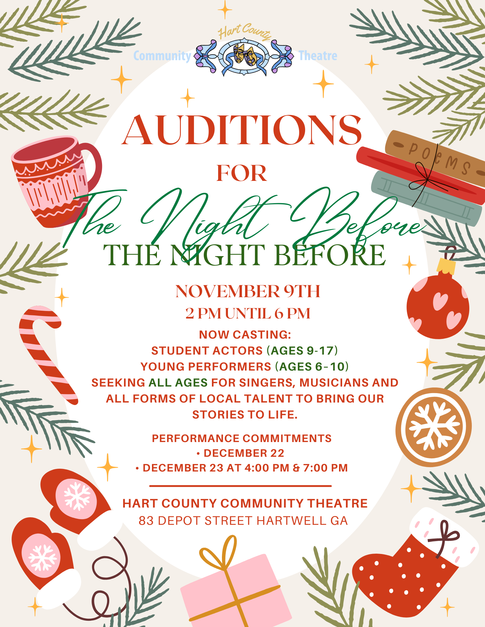 Hart County Community Theatre conducts open auditions for all productions, and anyone is welcome to come express their interest in participating.