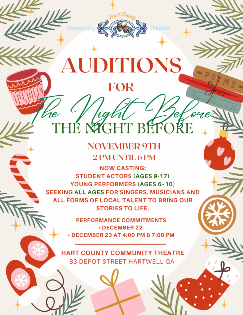 Join us for an evening of laughter, music, and heartwarming holiday spirit as our town comes together to share the magic of the season! For more information, contact Hart Community Theater online.